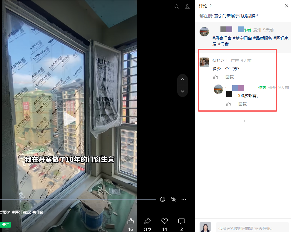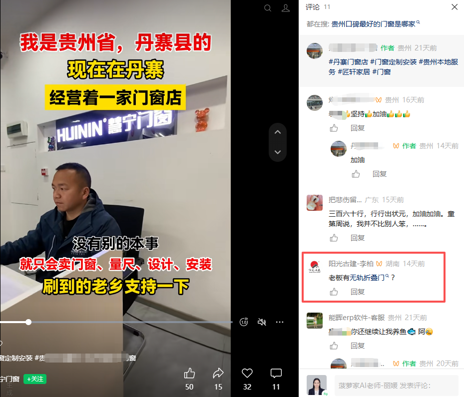 菠萝家AI短视频项目深度贴合本地家装市场,内容围绕同城业主高频搜索的“本地封阳台怎么选”“隔音门窗哪家靠谱”“小区装修注意事项”等问题展开,自然植入门店信息和品牌优势。业主刷到相关内容时,会觉得门店专业、靠谱、懂本地需求,从而主动咨询。很多经销商表示,同城短视频的曝光效果远超预期,门店在本地市场的声量快速提升,不再是“守着门店等客”,而是“主动出现在业主眼前”。