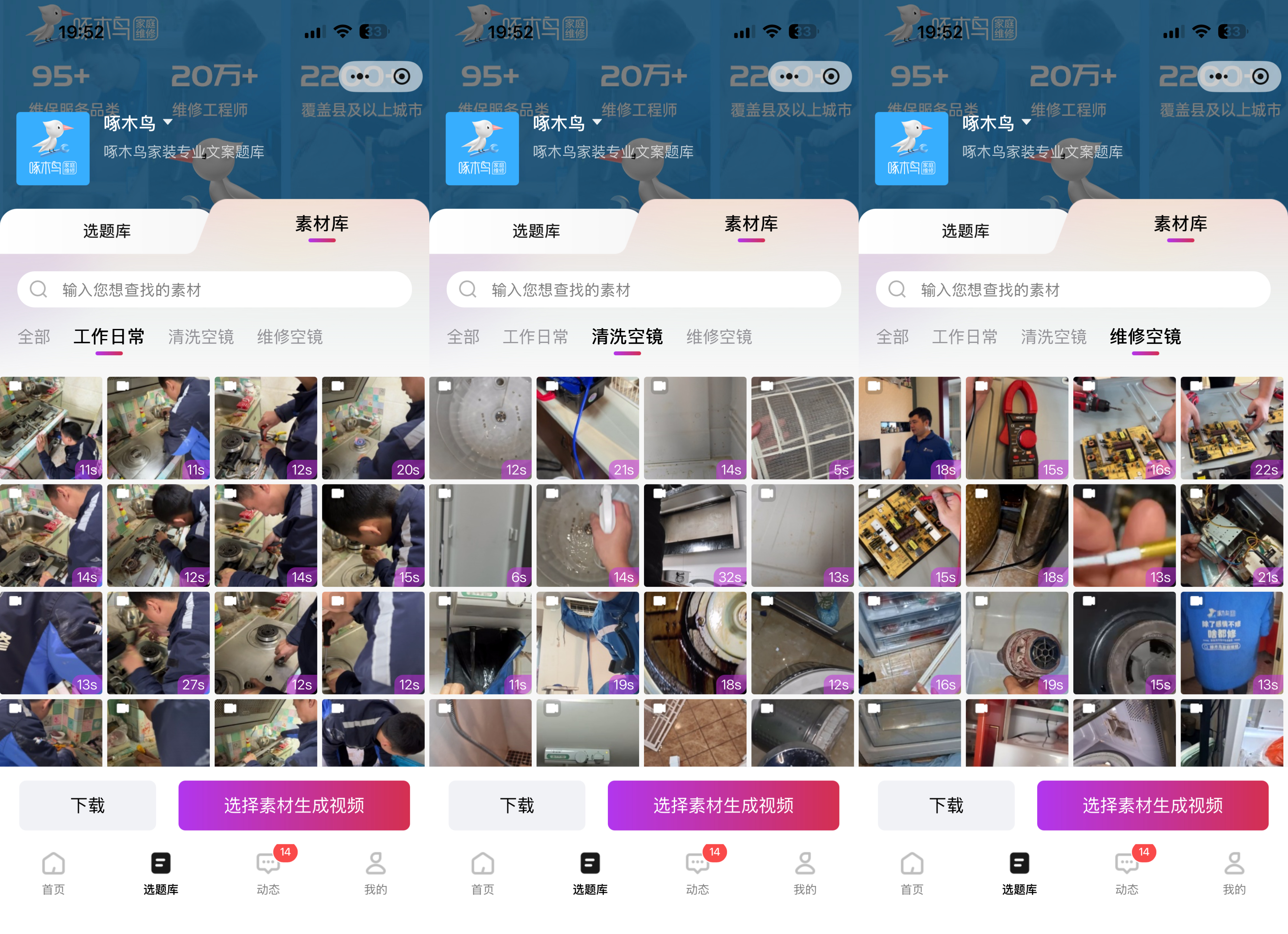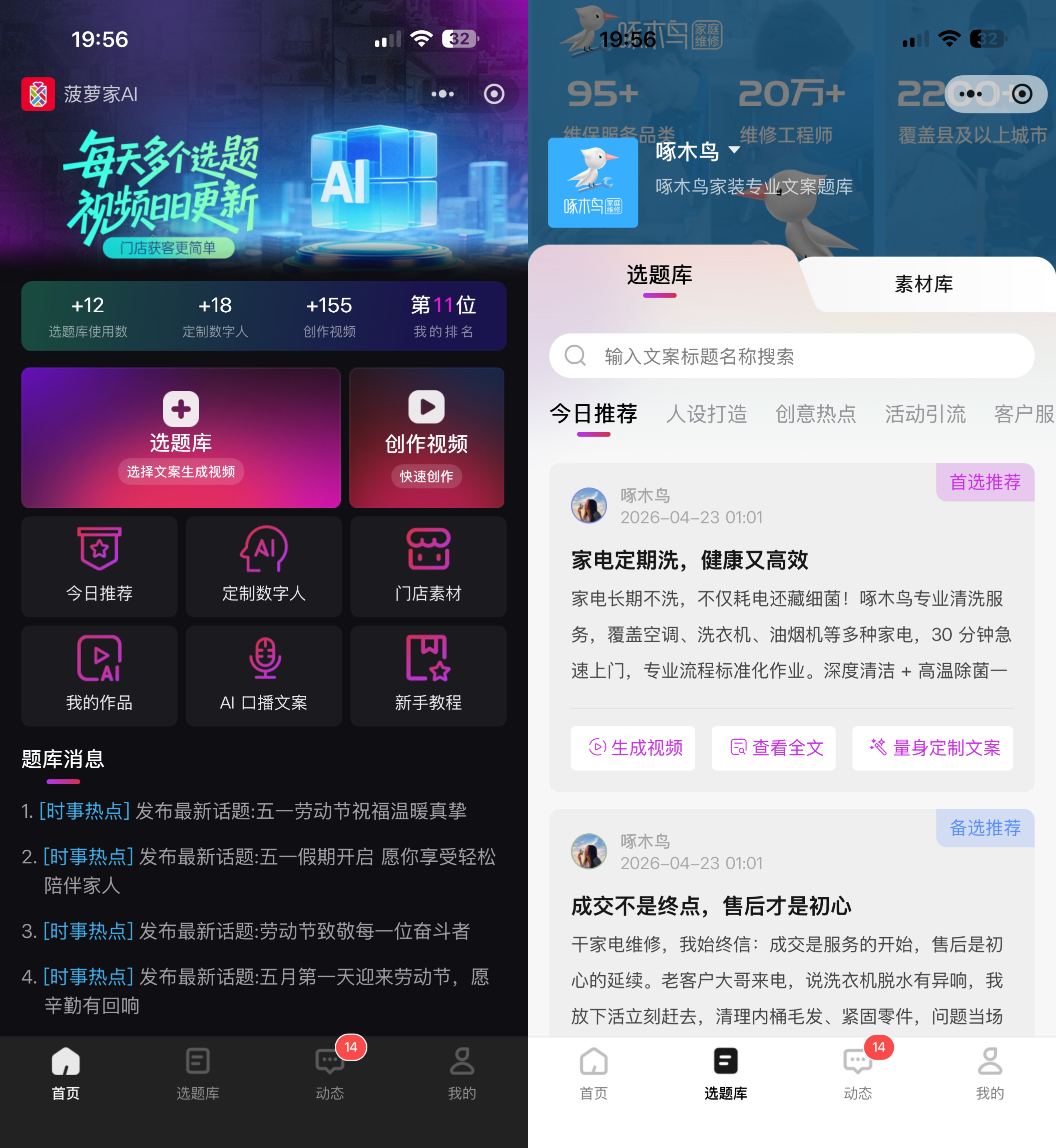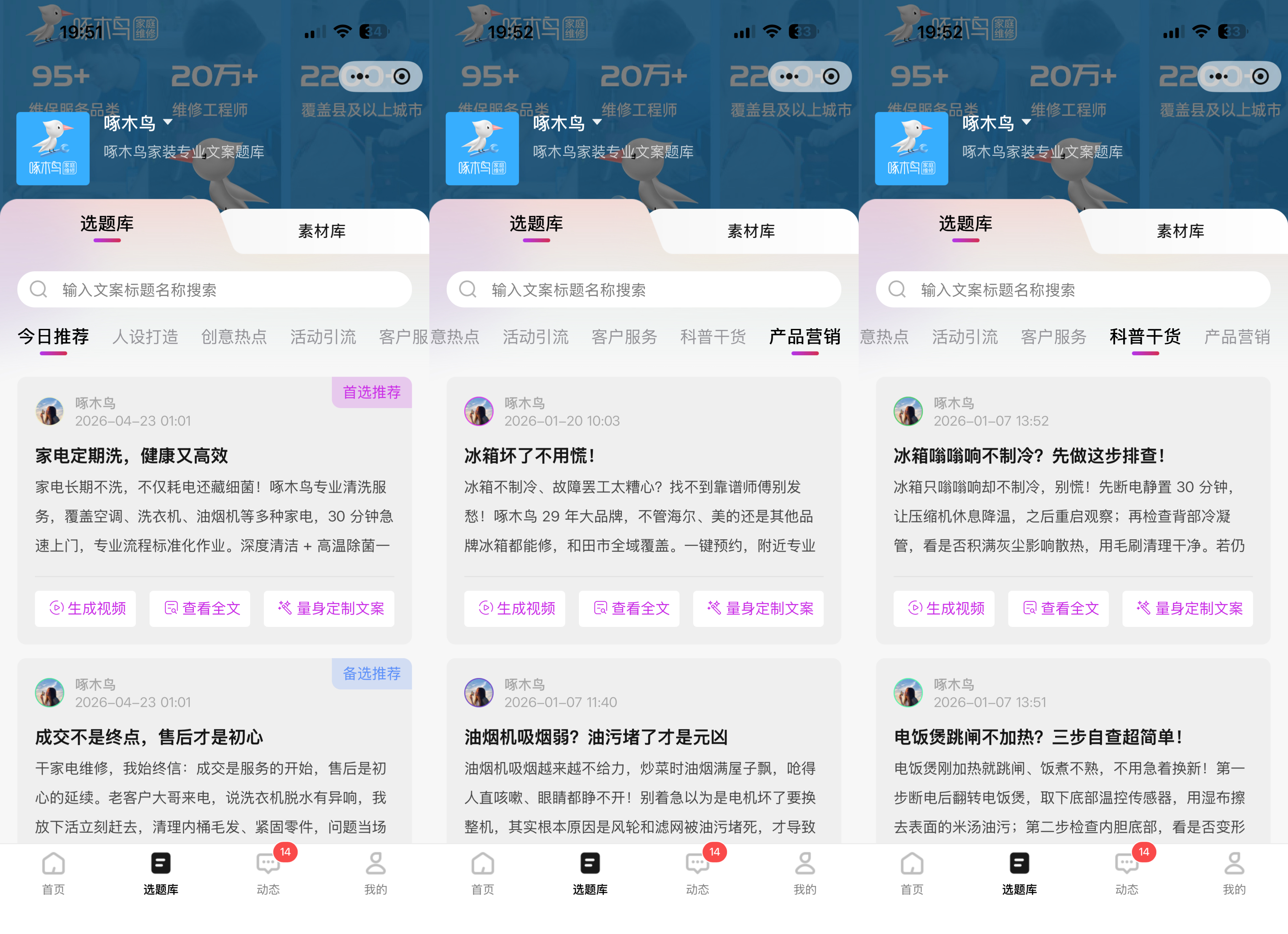针对品牌传播标准化需求,菠萝家AI为啄木鸟家庭维修定制专属AI内容中台,整合品牌宣传素材、维修场景案例、服务流程讲解等全场景内容,配合品牌梳理传播策略、规范传播口径,确保全国终端工程师产出的内容统一贴合品牌调性,强化品牌形象的集中传播。同时,优化运营模式,结合家庭维修行业“分散化、场景化”的特点,为工程师提供便捷的内容创作与传播工具,最大化发挥工程师的终端传播价值,让每一位工程师都成为品牌传播与获客的重要载体。