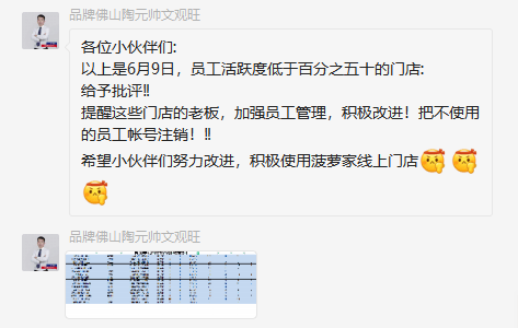 陶元帅在使用菠萝家系统推进门店数字化营销的过程并非一帆风顺。试运营的1个月里,大区经理和经销商都存在执行不到位、动作不清晰问题,门店店员的使用热度也不高,为此召开了复盘会议。